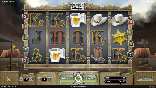 Dead or Alive – это слот с девятью линиями для выплат и пятью барабанами. На спин можно поставить от 1 и до 10 монет. В автомате Взять Живым Или Мертвым есть простые и специальные символы. Они выпадают на барабанах и формируют призовые комбинации на активных линиях. Чтобы получить выигрыш, на активной линии должно находиться минимум три одинаковых символа. В одном раунде может быть сразу несколько выигрышных цепочек, но учитывается только самая длинная. Выплаты по всем линиям могут складываться. Сумма выигрыша всегда зависит от размера ставки и коэффициента комбинации. В таблице выплат указаны все коэффициенты, а также последовательности. Множитель в игре может быть от х2 и до х1000. Характеристики аппарата: