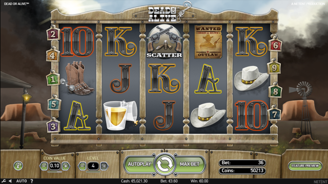 Тематика игры Dead or Alive – это Дикий Запад, поэтому символами в игре выступают: рюмка, ковбойские сапоги, шляпа, кобура с револьвером, звезда шерифа, номиналы игральных карт. Самые большие выигрыши приносят комбинации с символами звезд, шляп и кобуры. Номиналы игральных карт приносят самые маленькие выигрыши. Специальными функциями наделено изображение бандита (Вайлд) и скрещенные пистолеты (Скаттер). Дикий символ заменяет все изображения и может сам формировать призовые комбинации. Скаттеры оплачиваются в аппарате независимо от месторасположения. Выпадать они могут на любых барабанах и приносят самые большие призы. Три таких символа запускают бесплатные вращения. Во время вращений Дикие символы становятся липкими. Благодаря такой функции во время фриспинов разыгрываются большие призы. Сыграть в онлайн-автомат Dead or Alive может каждый клиент казино и получить большие призы. Ведь в игровом аппарате высокий процент возврата и средняя волатильность.